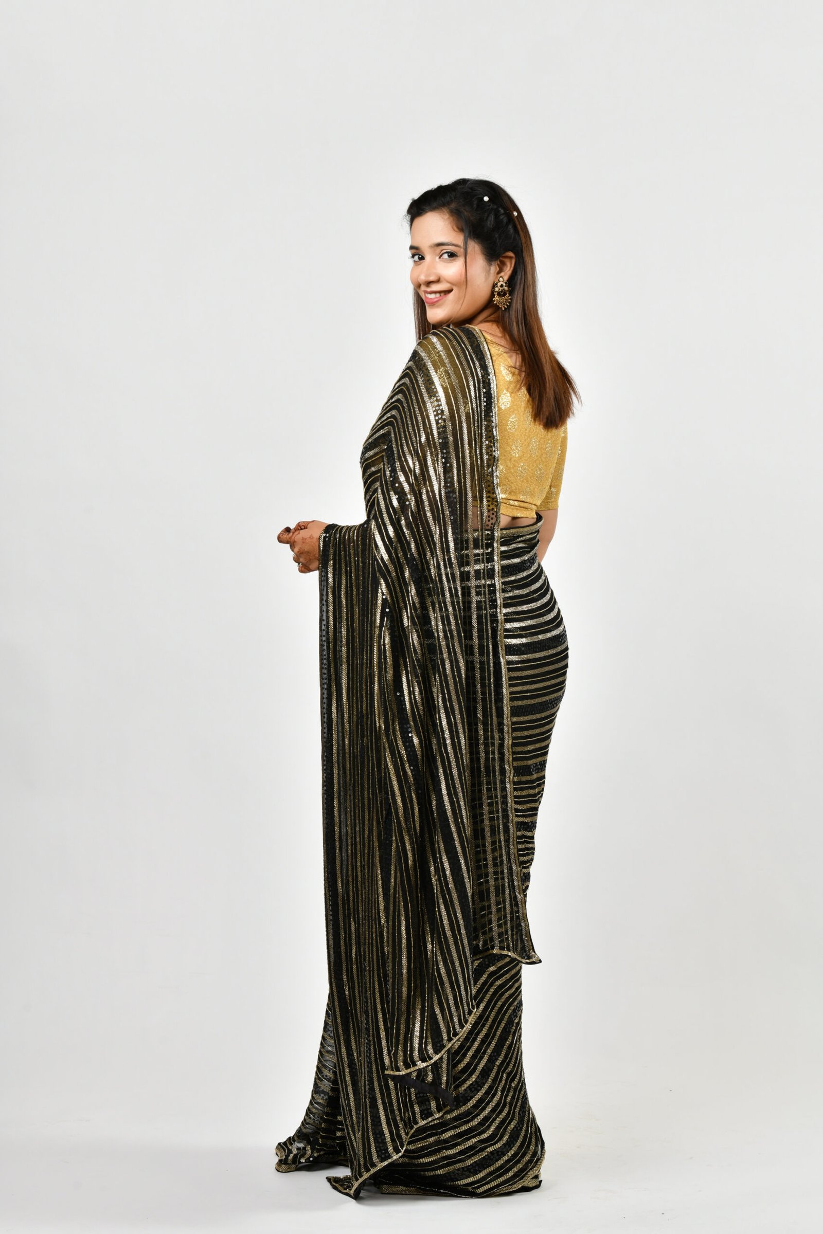 Black & Gold Striped Party Wear Saree with Golden Blouse