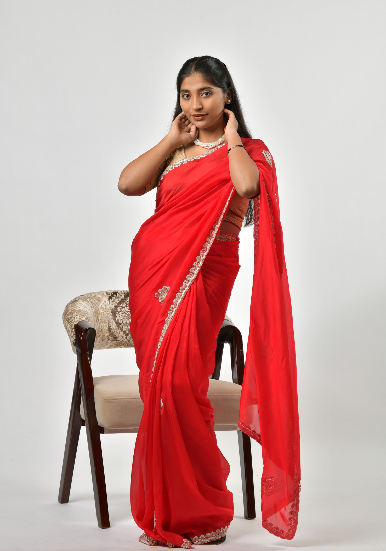Make a stunning style statement with this elegant red saree that radiates sophistication and charm. Featuring delicate embroidered motifs and a shimmering lace border, this saree is perfect for festive celebrations, weddings, and parties. Crafted from lightweight fabric, it ensures effortless draping and all-day comfort while maintaining a glamorous appeal.