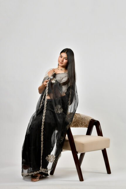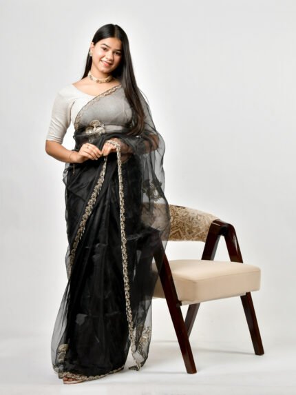 - Intricate floral embroidery in contrasting colors across the borders and pallu