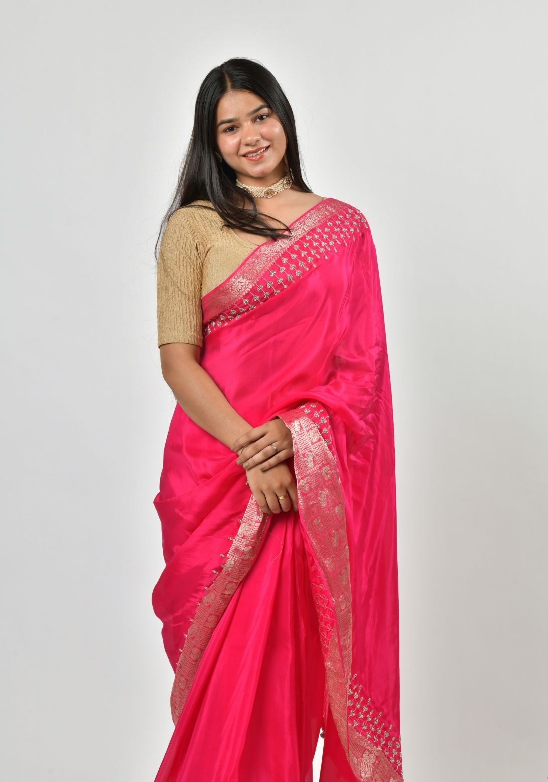Adorn yourself in this exquisite magenta silk saree, a true masterpiece designed to captivate and charm. Featuring elaborate floral embroidery in delicate hues of pink, white, and green, this saree is a perfect choice for weddings, grand celebrations, or any occasion where you wish to make a sophisticated statement.