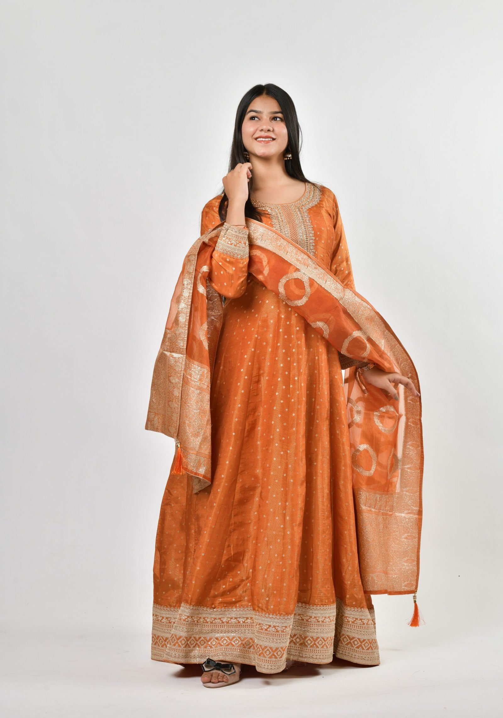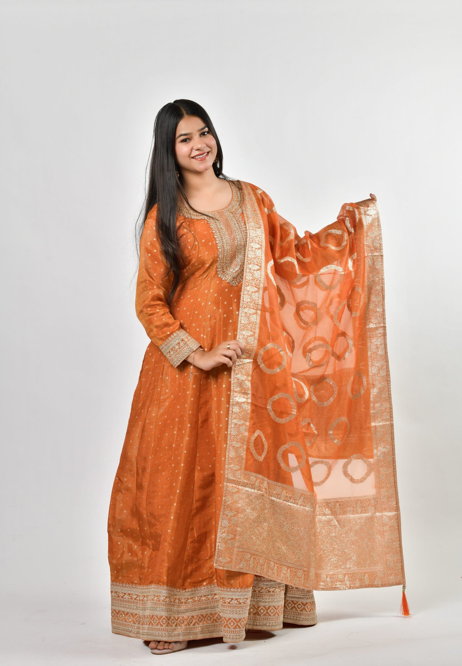Radiate traditional charm in this Rust Orange Silk Kurta Set, adorned with delicate embroidery and paired with a luxurious Banarasi dupatta. Perfect for weddings, festive gatherings, and cultural celebrations, this outfit blends timeless elegance with modern comfort. The rich hue and intricate zari work make it a standout ensemble for any special occasion.