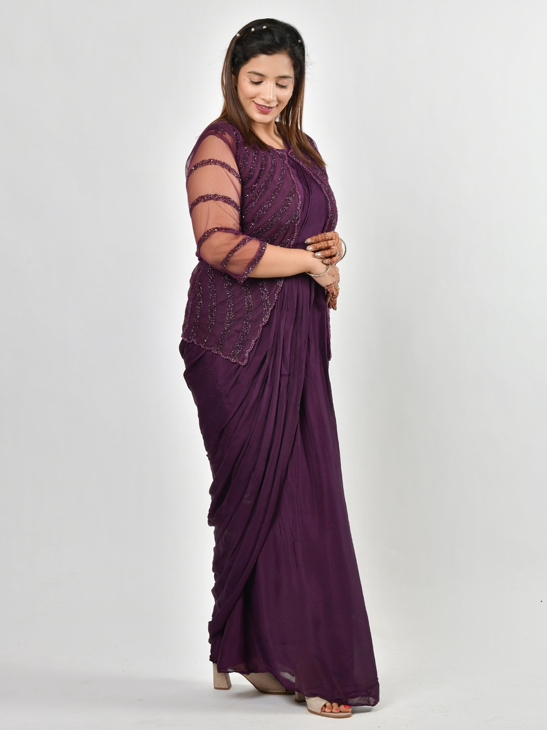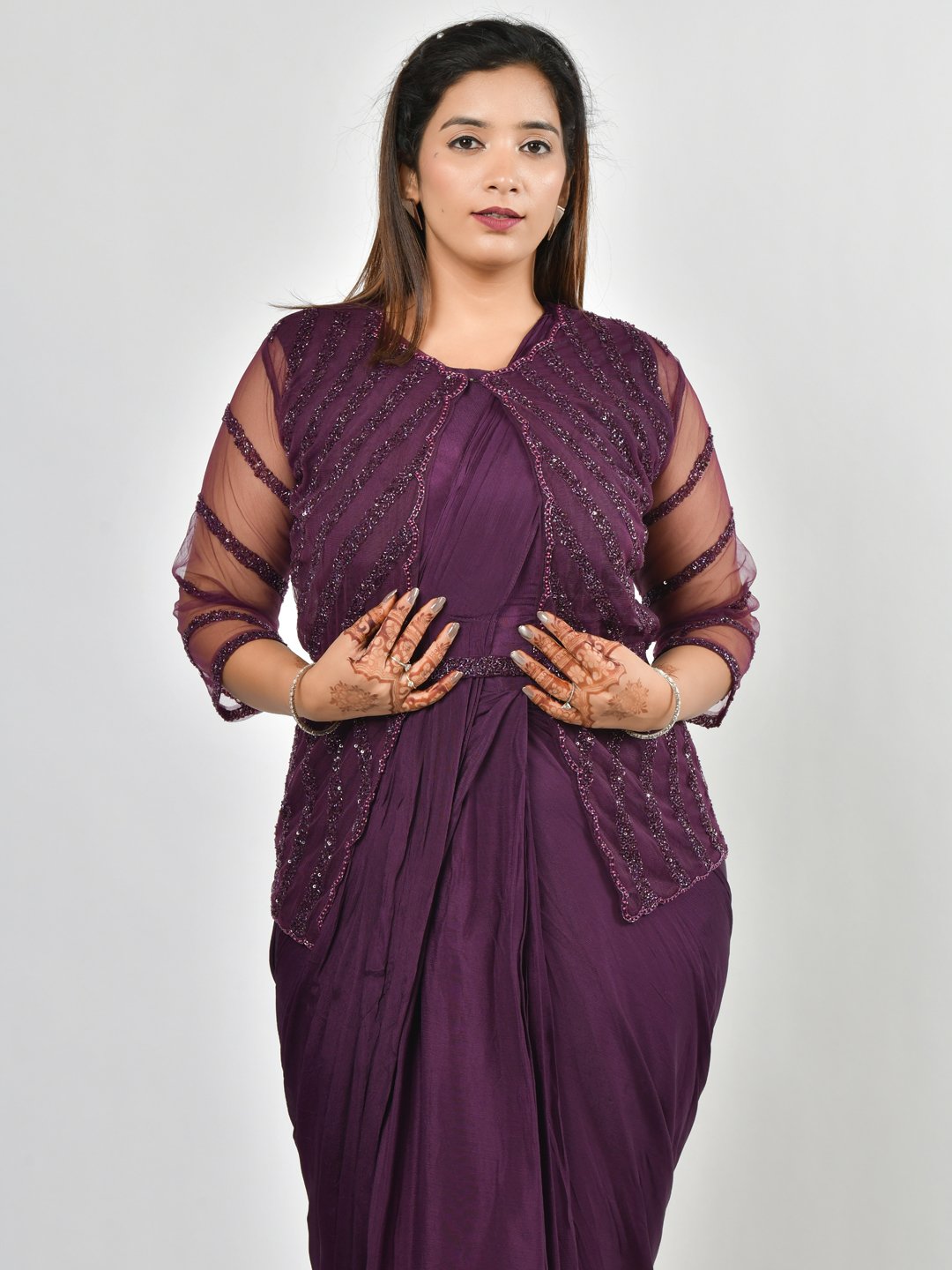 Turn heads with this stunning Wine Saree Style Gown with Jacket, crafted in premium Chinon fabric that offers a soft, lightweight, and flowy drape. The gown is designed in a graceful saree-style silhouette, making it a perfect blend of traditional elegance and modern styling.